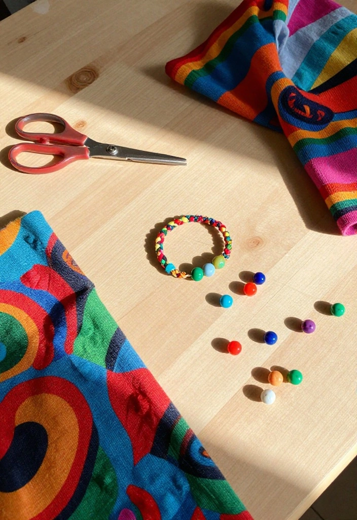 Turn an old t-shirt into a trendy braided bracelet that’s both stylish and eco-friendly. This project is super easy; just cut your t-shirt into strips and braid them. The final product is a soft, colorful accessory that brings life to any outfit.
