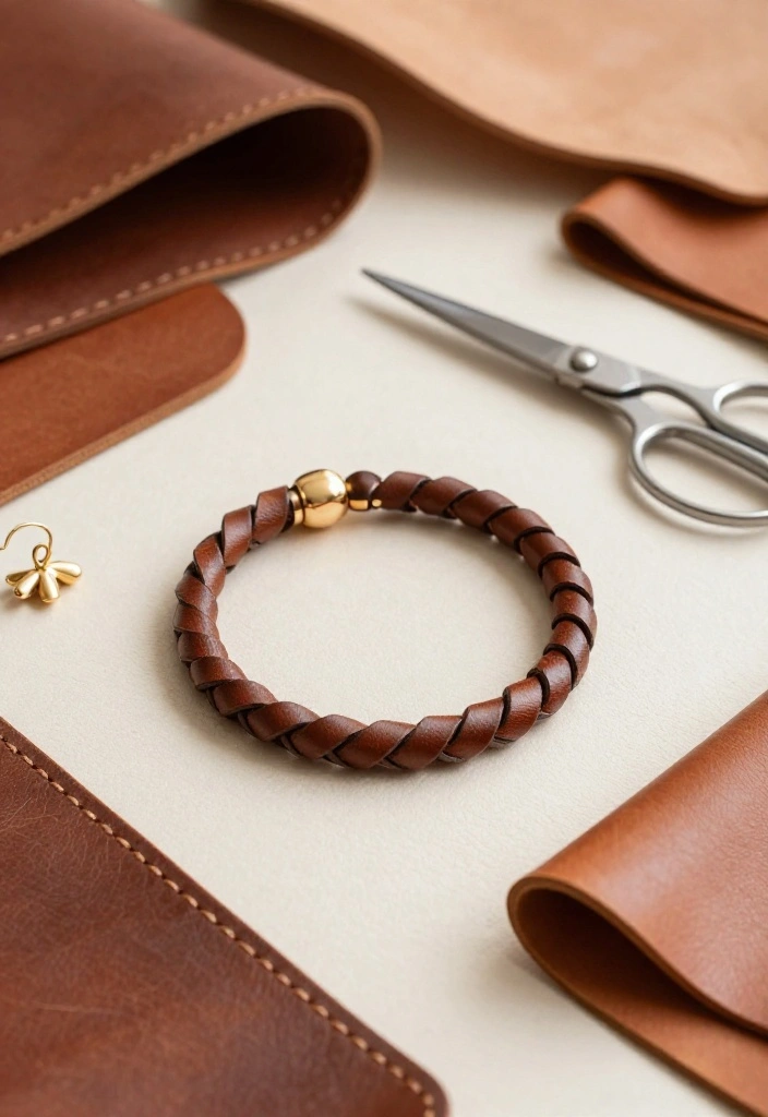 Transform leather scraps into a sophisticated braided bracelet that adds an edge to your accessory collection. This project is for anyone who loves a bold look while being eco-conscious by repurposing materials.