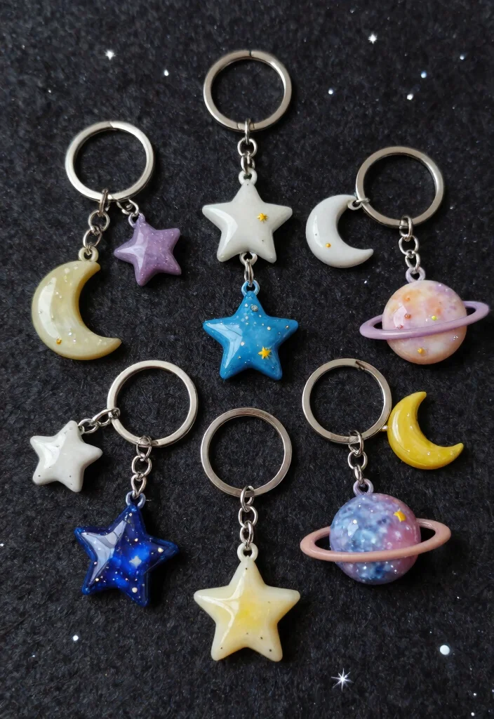 Design keyrings featuring stars and moons with glittery resin to capture the magic of the night sky.