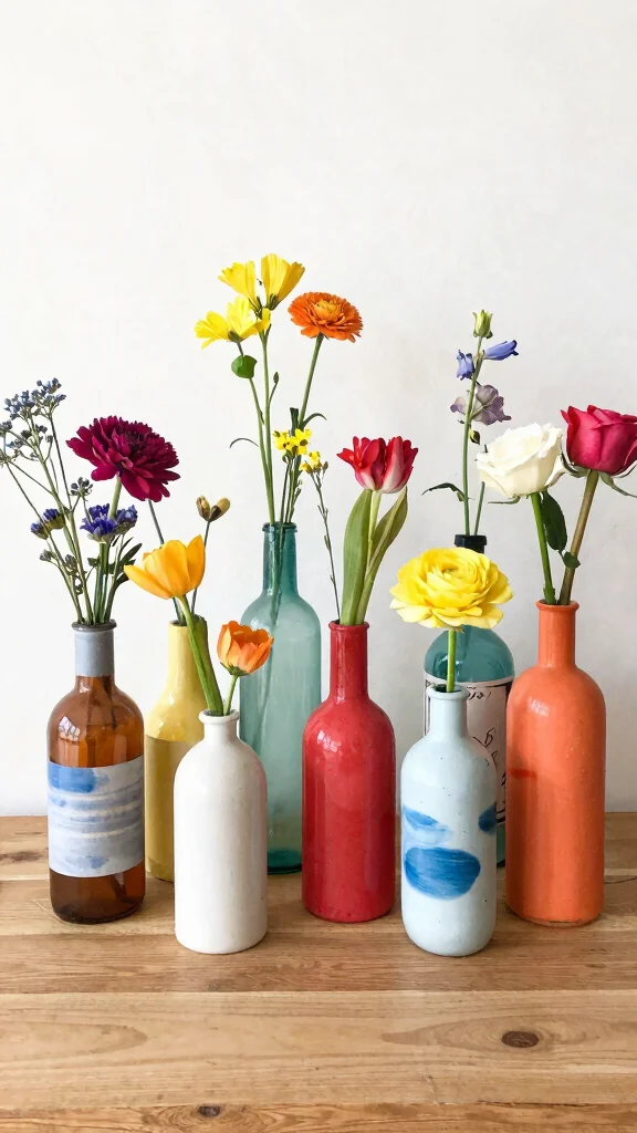 Simply clean the bottles, paint or decorate them as desired, and fill them with your favorite flowers. You can create a single statement piece or a cluster of varying heights for a stunning centerpiece that brightens up any room.