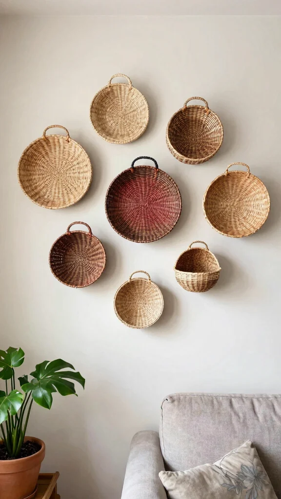 To create a stunning wall display, arrange the baskets in a pattern that suits your style. You might opt for a grid layout or a more organic, scattered design. This decorative element not only beautifies your walls but also serves practical purposes, such as storing small items or plants.