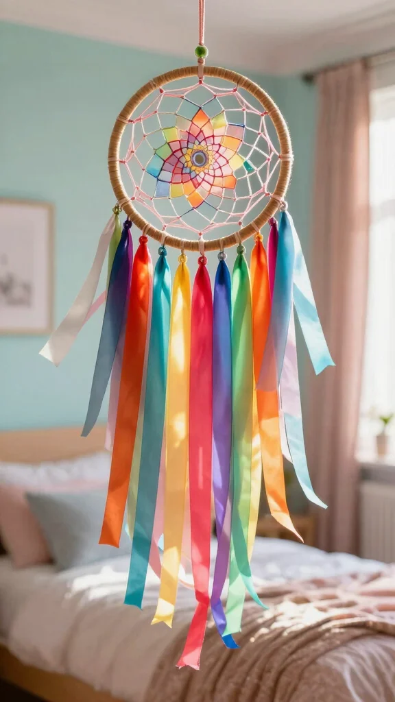Infuse your bedroom with color and whimsy through a ribbon dream catcher. This playful take on the classic design features colorful ribbons cascading like a rainbow, adding a cheerful vibe to your decor. Mixing different textures, such as lace, satin, and grosgrain, can create unique visual elements that enhance your creation.