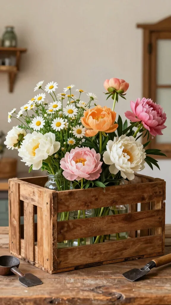Wooden crates are incredibly versatile and can be transformed into charming flower displays. Arrange small jars or vases within a crate for a rustic centerpiece or fill the entire crate with flowers for a bold statement.