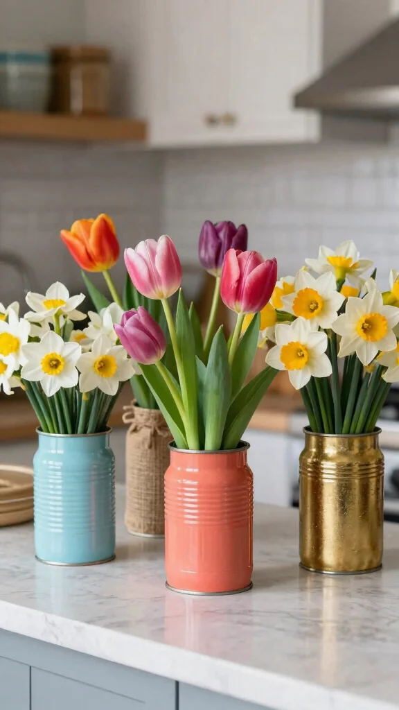 Transforming empty tin cans into decorative vases offers an edgy twist to any floral arrangement. Their industrial look can bring a casual, trendy vibe to your decor. With a little creativity, you can customize these cans with paint or fabric to match your personal style.
