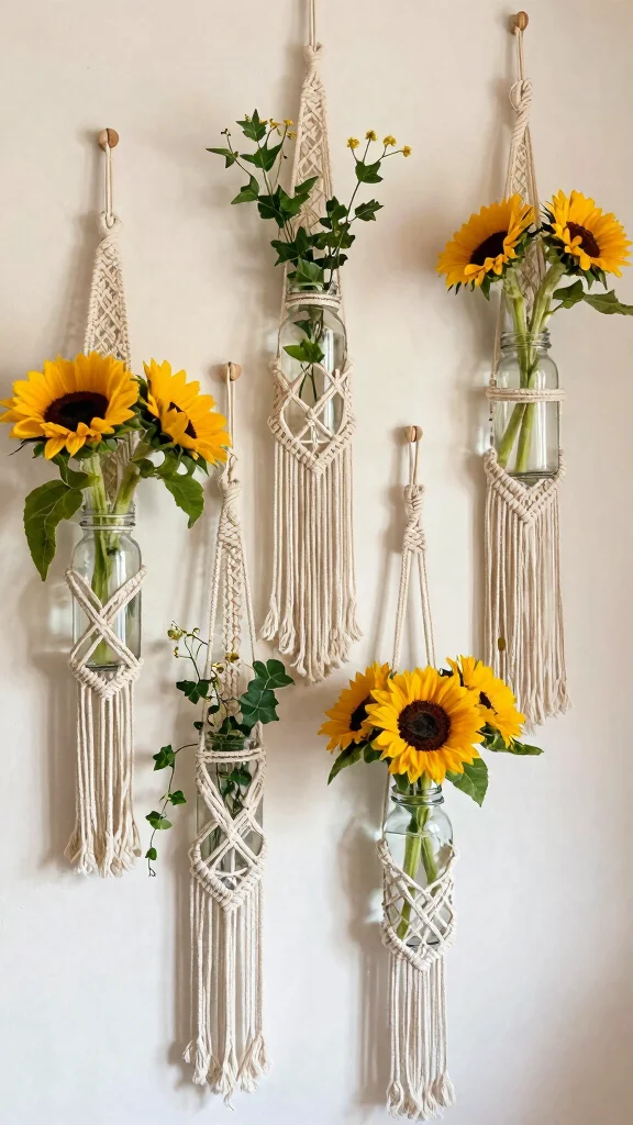 Macramé plant hangers bring a bohemian touch to your flower vases, adding texture and style to your decor. Crafted from cotton rope, these hangers can beautifully showcase glass jars or vases filled with flowers and greenery.