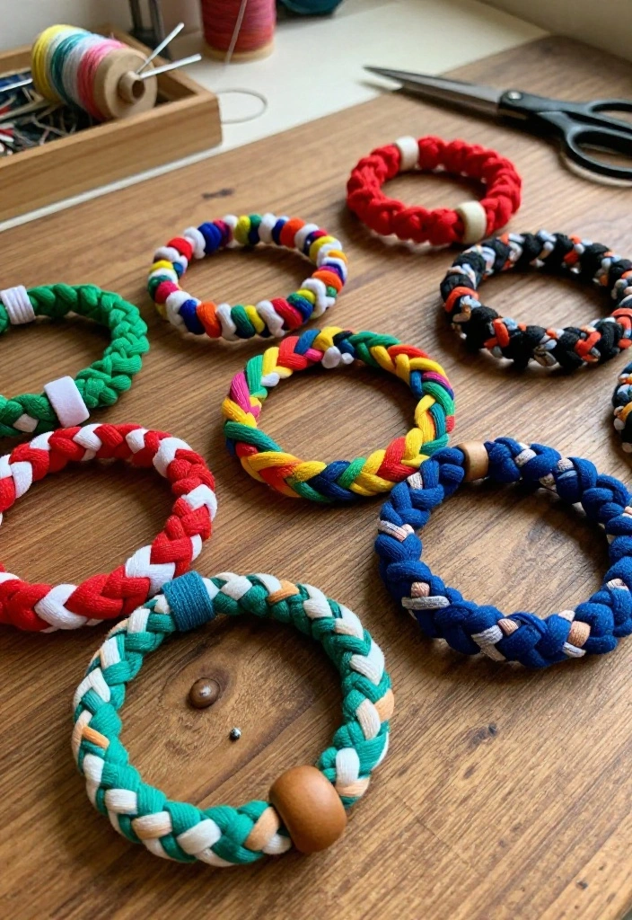 To make these bracelets, cut the t-shirts into one-inch strips. Braid the strips together, blending different colors for a vibrant design. You can tie knots along the way to add texture, and adjusting the fit is as simple as tying a knot.
