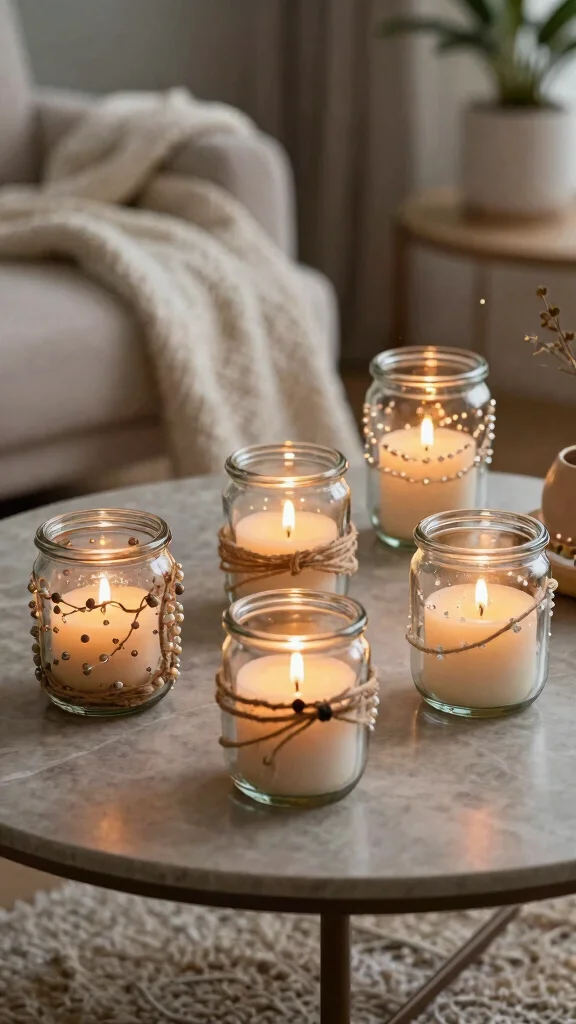 For added visual interest, consider decorating with beads or colored twine. Using various jar sizes can create an appealing height variation, and adding scented candles can enhance the atmosphere even more.