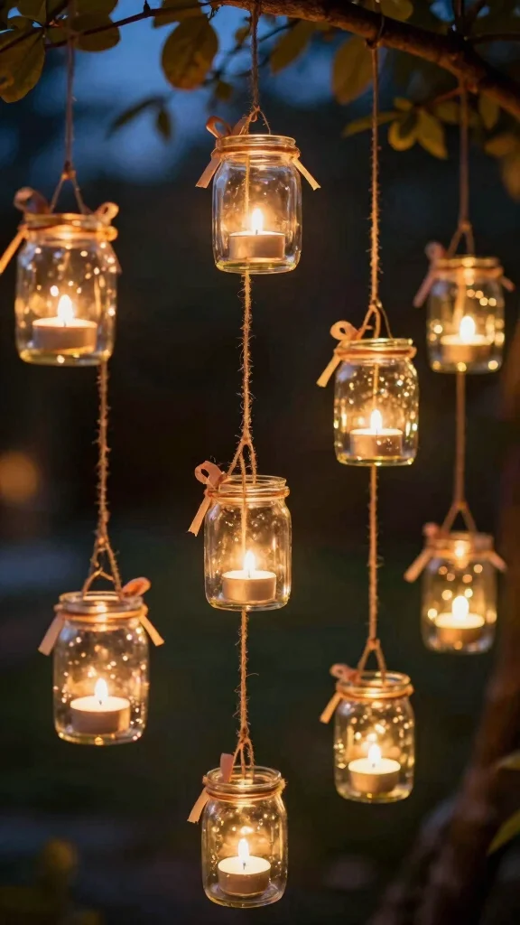 To enhance the rustic appeal, use twine or wire for hanging, and consider adding decorative elements like ribbons for added flair. Mixing various jar sizes can also create visual interest and depth.
