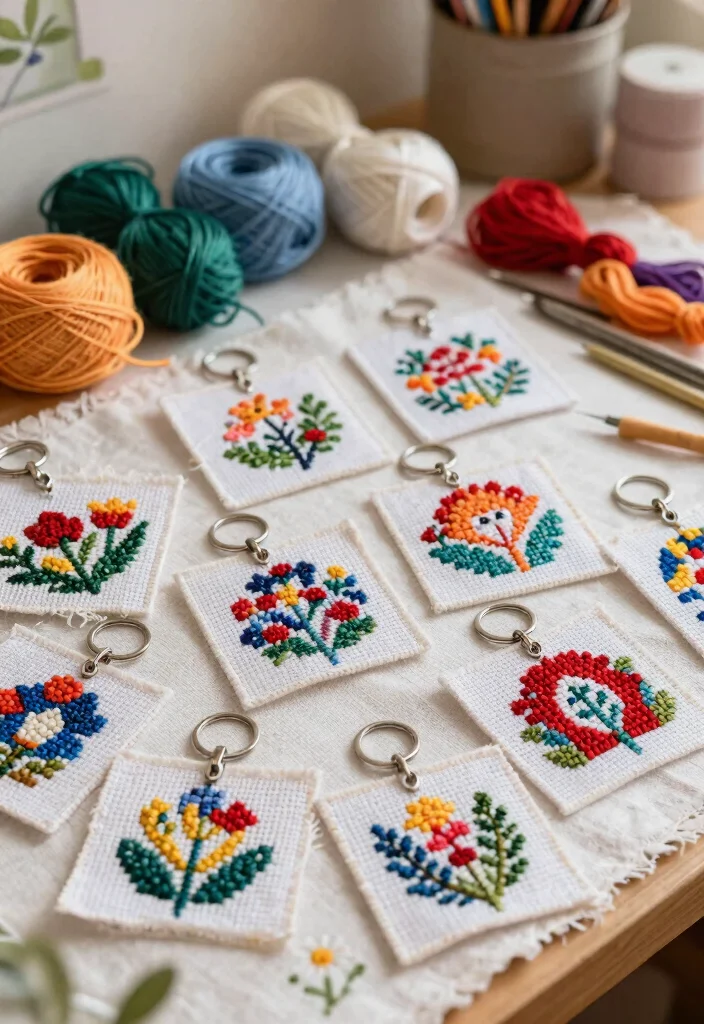 5) Simple felt or denim patch keychains with light embroidery.
