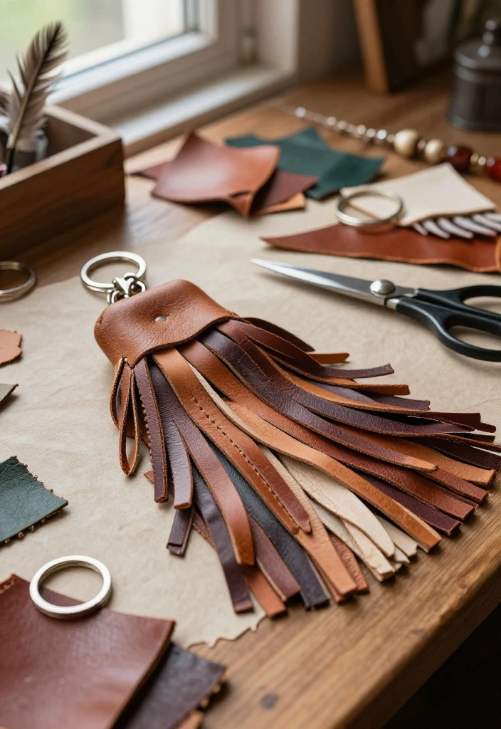 Leather fringe keychains bring a bohemian vibe to your everyday accessories. Repurposing leather scraps not only adds a trendy touch but also promotes sustainability. The movement of the fringe adds a playful element to the piece.