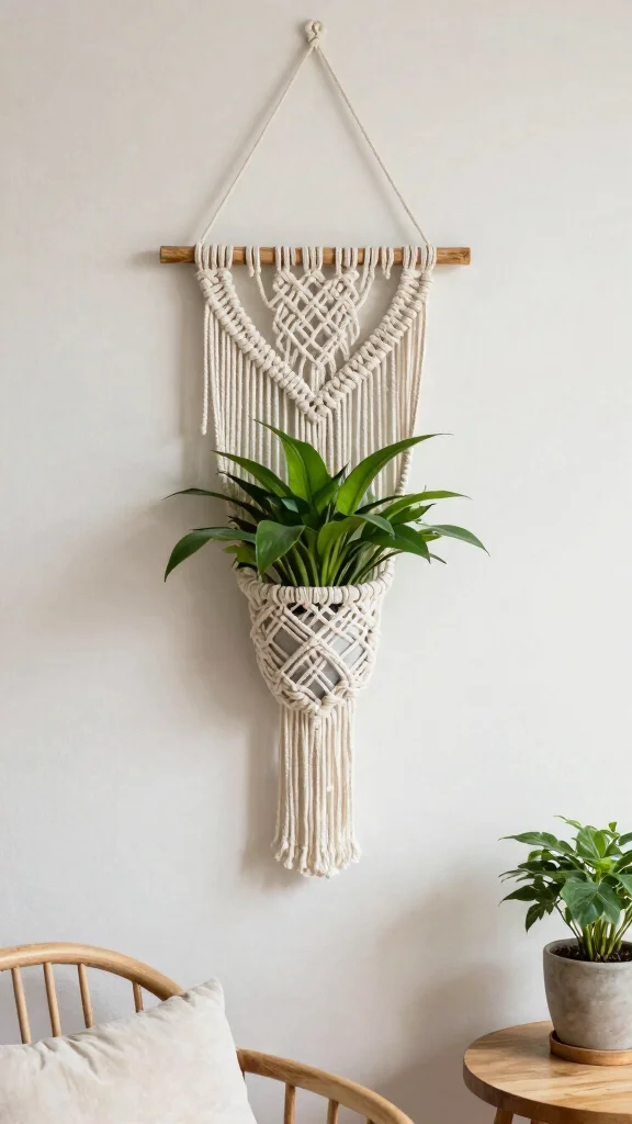 Design DIY wall art that includes macramé holders for plants, merging decor with greenery.