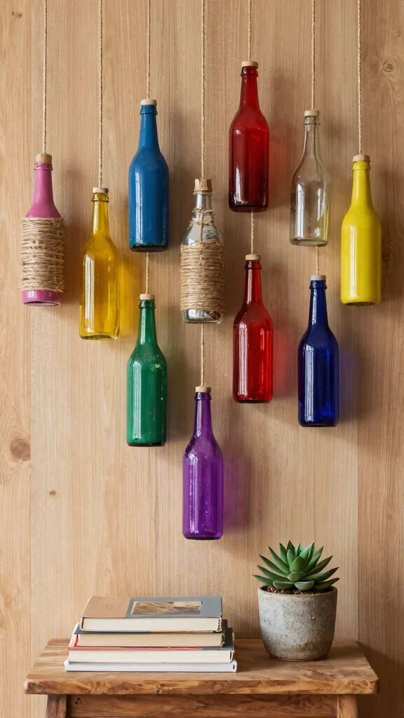 Add a splash of color to your walls with recycled glass bottle art. By painting or wrapping bottles with twine, you can create playful wall decor that brightens your space. This creative project not only recycles materials but also introduces whimsy to your home.