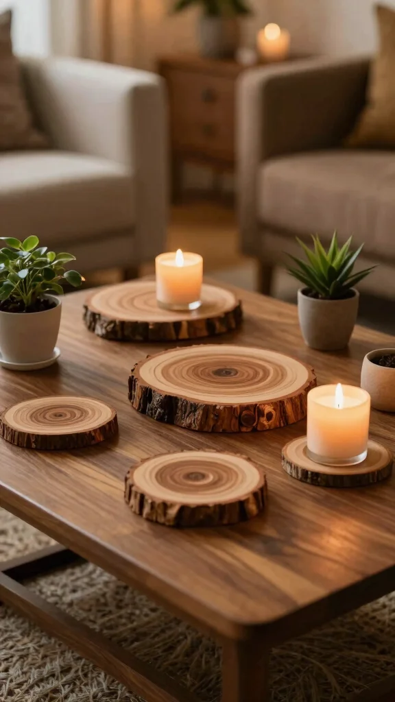 Introduce a touch of nature to your living room with natural wood slice table decor. Source wooden slices from craft stores or fallen branches, and sand the surfaces for smoothness. Treat them with natural oils for protection and shine.