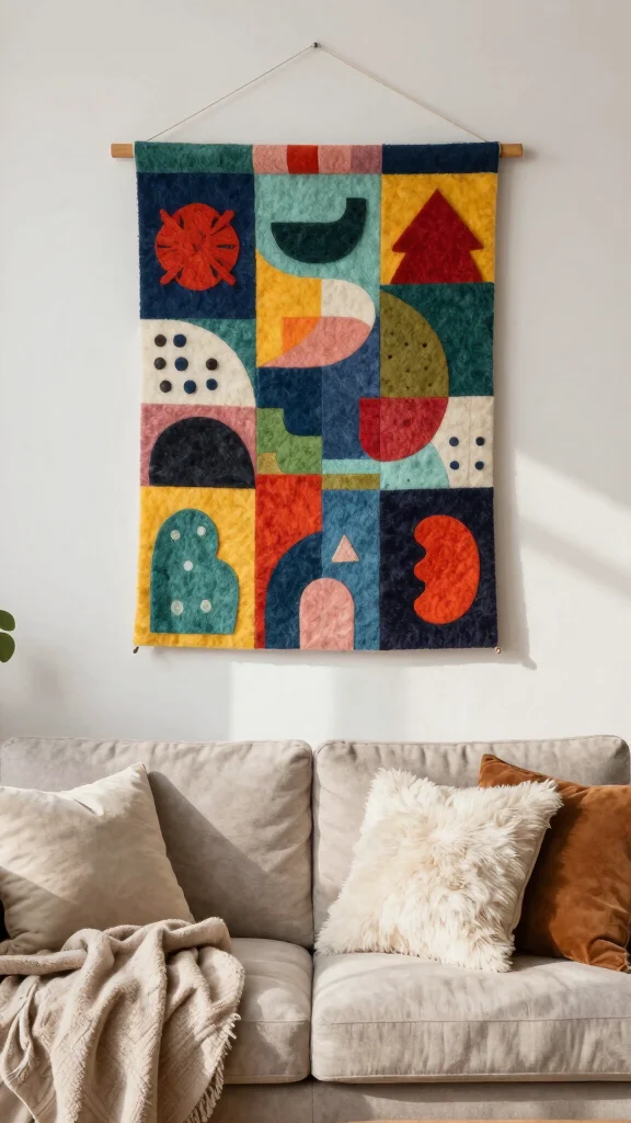 Add texture and color to your living room with a vibrant felt wall hanging. Choose a variety of felt colors and cut them into shapes like triangles or circles. Arrange them into an eye-catching pattern, then sew or glue them onto a wooden dowel for display.