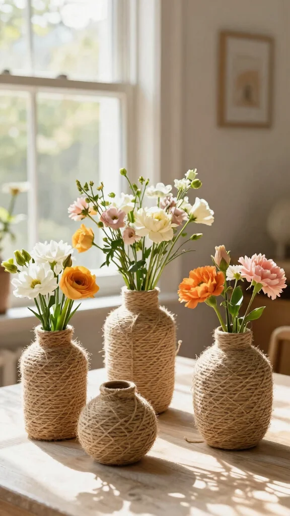 Breathe new life into old glass vases by wrapping them in twine for an appealing rustic look. Simply coat the vase in glue and start wrapping the twine around it, securing it as you go. Using different colors of twine can add texture and visual interest, while a plain wrap delivers a minimalist vibe.